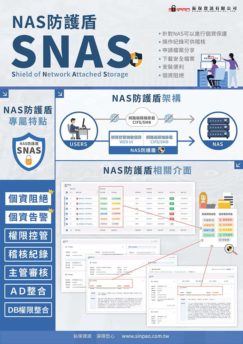 在檔案分享時,如何避免同時造成個資外洩的風險呢?鈊保資訊開發「NAS 防護盾Shield of Network Attached Storage」,除了一般文管系統的權限控管、稽核紀錄、主管審核、AD整合等功能外,也有市面上唯一可直接